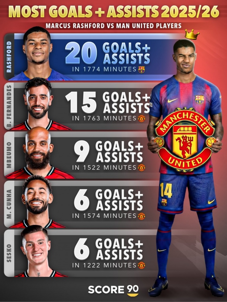 1月24日讯 据Score90统计,拉什福德本赛季参与20粒进球,参与进球数量多于任何曼联球员。
